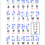 Braille AlphabetThis page has the Braille Alphabet, Numbers (Over the corresponding letters and a Key showing what a Braille cell looks like. Starting from the Left side – Top to Bottom we have cells 1,2 and 3 – On the Right side we have cells 4 (Top), 5 and 6. The numbers under the letters represents the cells. “A” is the number 1, while “T” is 2345. This makes it easy to figure out. |